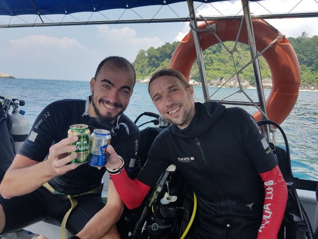 Nach 9 fast ausschließlich hypernicen Tauchgängen auf Tioman, überraschenderweise supersonnigem Wetter, interessanten Gesprächen mit u.a. David, Amir, Kay, Josh u.v.m., einigen Duty Free Bieren sowie Black Pepper Squids geht auch die schönste Zeit irgendwann einmal zu Ende: die Fähre brachte mich um 16h zurück ans Festland. Doch zuvor gab es zum Abschluss noch zwei super Tauchgänge unter der Führung von Stephano. Einmal endlose Felder und Klippen mit Seafans und zum anderen schön enge Swim-Throughs. Genial! An Boot hatte ich dann für Davids 50ten Tauchgang eine Überraschung vorbereitet: