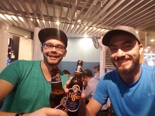 Das Wiedersehen mit Yannick aus meiner FSJ-Zeit beim DRK. Es hat geklappt! Zuletzt vor ca. 7 Jahren auf der Studienfahrt nach Krakau gesehen hat er neulich aus Zufall in meinem Blog gelesen und festgestellt: Der Tetrakusmannikov ist in Singapur? Solomon ja auch 😀 also hat er mich angehauen, dass er geschäftl. eine Woche hier ist – zufällig genau die, in der auch ich hier bin! Dass dann auch noch ein Vertretertreffen ausgefallen ist, hat uns gut in die Karten gespielt. Abendessen in Chinatown – fried Chicken mit 3000 Chillischoten sowie das erste Bier, eine chin. Marke, dies nicht ganz so ernst nimmt mit dem Reinheitsgebot. Dafür kostete es nur 5SGD.