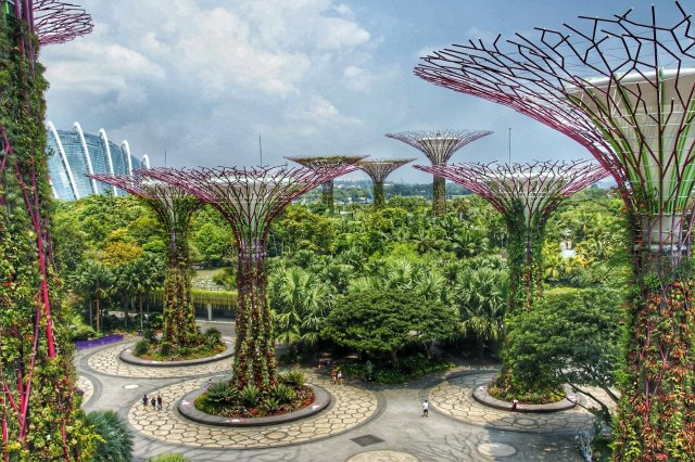 Etwas südlich von diesem Bereich befindet sich die Anlage Gardens by the Bay. Mit ihren funktionellen Groove Trees und der dazwischen liegenden Skybridge lockt dieses Areal allabendlich mit einer tollen Lichtershow. Tagsüber kann man dann in den angegliederten Flower Dome und Cloud Forest verschiedenste Botanik in diesen Gewächshäusern betrachten. Ebenso gesalzene Eintrittspreise wie kaum Abenteuerwert hielten mich davon auch ab. Die Gebäude sind von außen auch schön anzusehen 😉