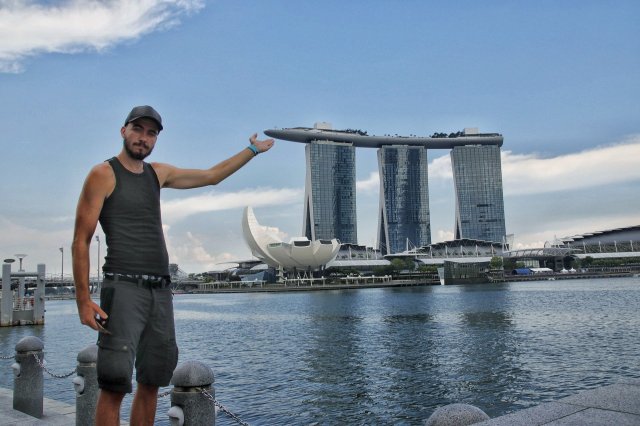 Hauptattraktion Singapurs ist wohl mit Abstand Marina Bay Sands. Das 2010 erbaute Luxusresort trägt auf den drei 55 Stockwerken hohen Gebäudeteilen die 340m lange Aussichts/auslegerplattform. Hier kann man für günstige 25SGD ein Getränk nehmen und vermutlich auch in den Infinity Pool springen. Dieses Vergnügen habe ich mir allerdings gespart, und den Sands Komplex lieber von der Marina Bay selbst bestaunt, da von unten gesehen das Resort und die Skyline umso imposanter wirken. Und da ich den nötigen Dresscode nicht mitführe…