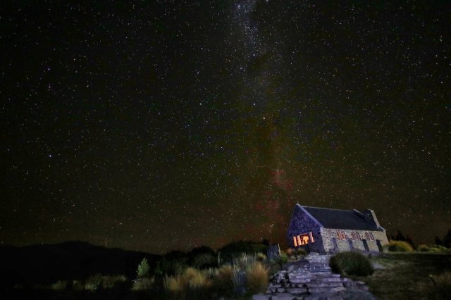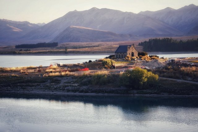 Doch das alles wird dann noch von der Church of the Good Shepherd aufs nächsthöhere Level gehoben. Diese kleine Kapelle wurde 1933 erbaut und fasziniert seither jeden Anwohner wie auch Touristen, denn mit dem See und Alpenpanorama im Hintergrund gibt sie ein hervorragendes Fotomotiv ab. Nicht umsonst wird sie auch als die meist fotografierte Kirche Neuseelands genannt. Genau deswegen hab ich sie auch aufgesucht. Zu finden war sie zudem nicht schwer, da sie quasi im Zentrum vom Tekapo steht. Dort angekommen musste ich dann leider feststellen, dass die Parkanlage drumrum gerade eine Baustelle war und ich so gar nicht nahe an die Kirche rankomme. Doch das lag nicht, wie ursprünglich gedacht, an dieser Baustelle, sondern an den Öffnungszeiten (die Kirche war bereits geschlossen) und an der dort stattfindenden Hochzeit: