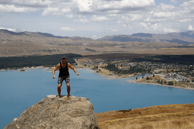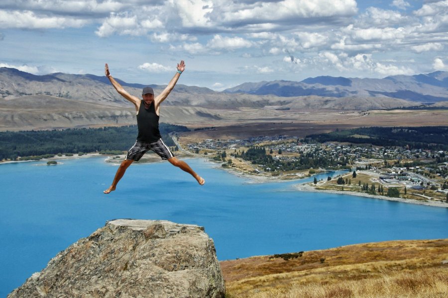 - Vom Mt. John die Aussicht über See und Umland genießen. Diesen Berg kann man entweder vom nahegelehenen Spa Center per beschwerlichem Fußmarsch erreichen, oooder allerdings über die Mt. John Observatory Road für 8$ auch einfach mit dem Auto bezwingen. Darüber war ich dann sichtlich erfreut:
