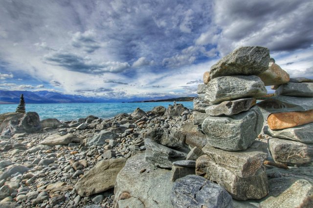 Von Tekapo bin ich ja über einen weiteren so genannten Scenic Drive Richtung Mount Cook Village gefahren. Doch ersteinmal musste ich ich dafür den Lake Pukaki umrunden. Dort eröffnete sich bereits die erste Aussicht auf den da noch in Wolken gehüllten Berg – vorbei an kleinen von Travellern gebauten Steinskulpturen: