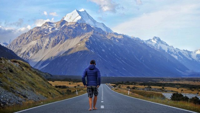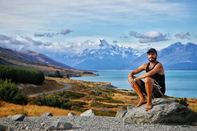 Ebenso beim Fotoshoot einige Kilometer später auf offener Straße – hier habe ich durch Glück mir aufklarendem Wetter genau den Shot schlechthin erlangt – inklusive Sicht auf den Gipfel des fast 4000m hohen Mt. Cooks: