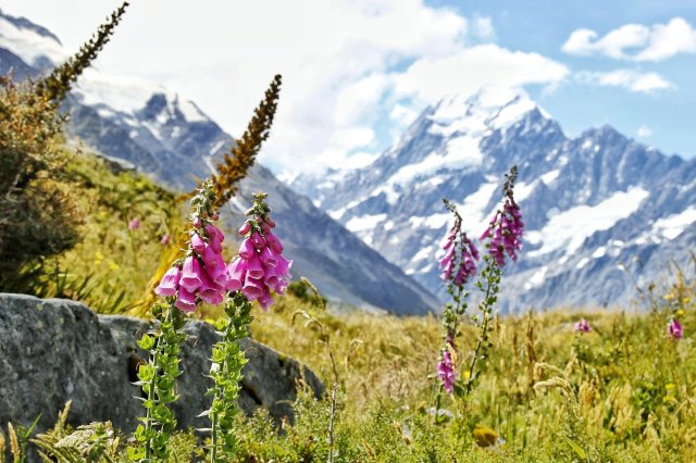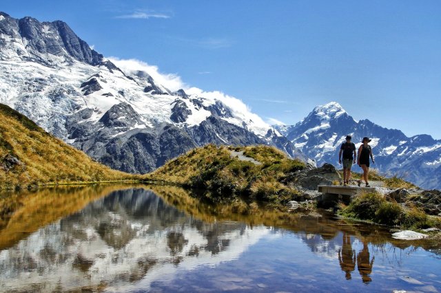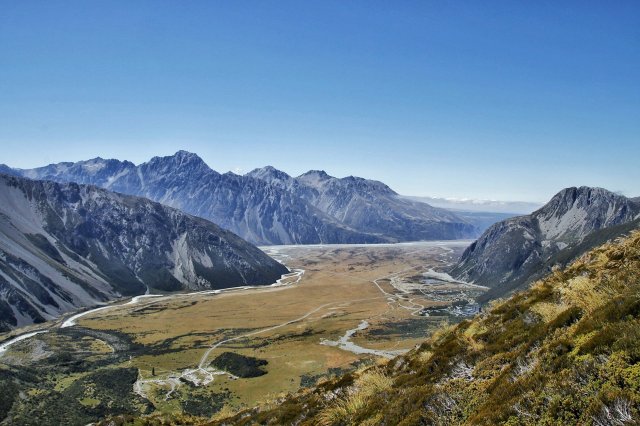 Denn für mich stand dann noch eine dritte Wanderung auf dem Plan: zur Hooker Valley. Alleine gestartet habe ich kurz nach dem Denkmal der auf Mt. Cook verstorbenen Kletterer den Rentner Greg aus Kanada getroffen. Wir hatten überraschenderweise fast das gleiche Gehtempo und in sehr vielen Punkten die gleiche Meinung, sodass der ca. 1.5h Weg durch Wetlands und über Hängebrücken wie in Nu verging.
