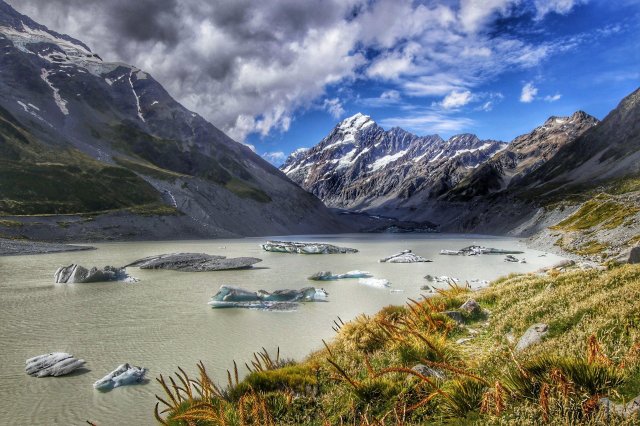 Am Ende dieses eher als Spaziergang zu bezeichnenden Hikes stand dann die Aussicht auf den vom Hooker Gletscher gebildeten Eissees, in dem sogar große Gletscherbruchstücke schwammen.