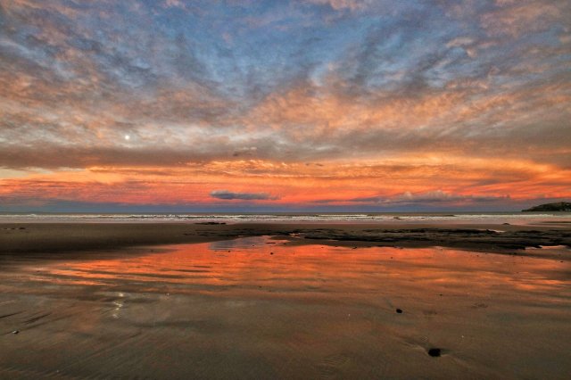 Hier trafen wir auch Christian aus Deutschland, der mit exzellentem Equipment und einen hervorragendem Auge fürs Bild einen Fotourlaub durch Neuseeland macht. Er verbrachte fast den ganzen Tag an diesem Ort und konnte einen beim Zeigen seiner Bilder auf der Kamera wirklich neidisch machen… Auch wenn er die Sonnenuntergangsreflektion im nassen Sand nicht sehr spektakulär fand, war diese mir ein Bild wert: