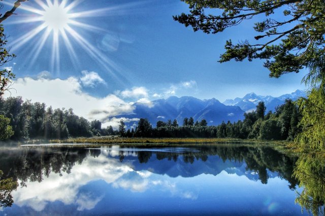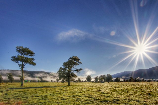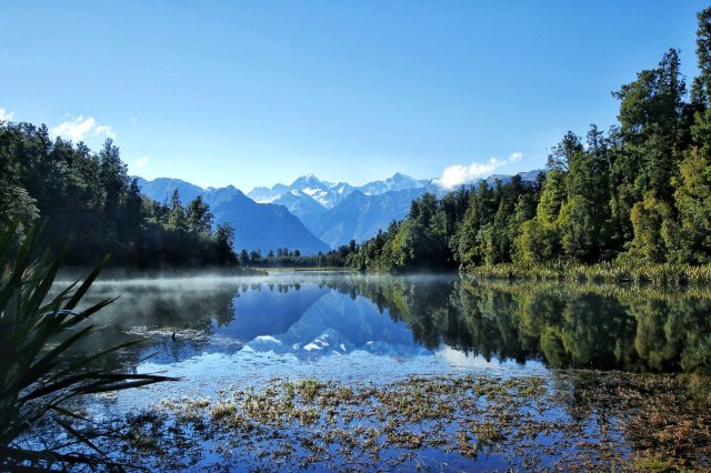 Nach diesem Stop auf dem Eis war der Rückflug dann um einiges zügiger als der Hinflug, vermutlich weil wir ja jetzt alles gesehen haben 😉 allerdings hat die nun weiter aufgegangene Sonne das Farbenspiel nochmal verändert, sodass jeder auch bekannte View ein neuer war! In diesen spannenden Morgenminuten sind wir deswegen nach der Landung dann auch zügig zum Lake Matheson gefahren. Bereits auf dem Weg dorthin verzauberte die dampfende Morgenlandschaft: