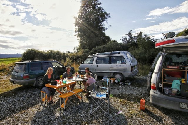 So klassisch Campinglike wie der Tag aufhörte, begann der nächste: Ausschlafen, über offene Fenster mit den anderen im Halbschlaf befindlichen Schmarrn labern, 80er Playlist bzw. ausschließlich Toto Africa laufen lassen, iiirgendwann aufstehen und genüsslich Rührei mit Schinken, Camembert und Kaffee schnabbulieren 🙂 ohne jegliche Eile brachen wir dann irgendwann im Viererkonvoi Richtung Hokitika auf, da es dort wohl erst die nächsten öffentlichen Duschen gäbe.