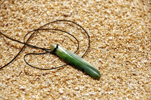 Leider hatte die am Ort führende und einzige Werkstätte nur noch für den Folgetag etwas frei und war mit 190$ für Jade dann doch etwas teuer. Wir räumten uns erstmal bisschen Bedenkzeit ein. In dieser, am Strand spazierend und auf der leider nicht von Erfolg gekrönten Suche nach eigenen Jadesteinen, fand ich dann eine weitere Werkstatt im Internet, die den ganzen Spaß angeblich für nur 40$ anbot. Bei 11km Anfahrt dachten wir uns, kann man nichts falsch machen und fuhren mal hin. Vor Ort landeten wir bei einem Hotel mit Bar in dessen gepflegten Hinterhof ein Kiwi das Schleifen für sogar nur 20$ pro Stein anbot. Zwar waren hier keine komplexen Formen wie Spiralen oder Endlosschleifen möglich, allerdings wollte ich so eine Form ja eh nicht. Nach insgesamt über zwei Stunden waren wir glücklich mit unseren Werken – Lisa carvte ein Blatt und ich eine geschwungene komplex zu schleifende „Form“ – Surfbrett, Blatt oder Messer? Entscheidet selbst: