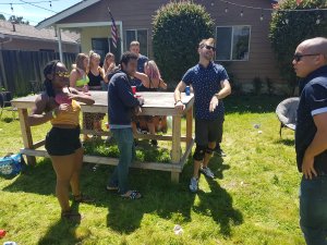 Das Spiel der Wahl: Dice (Würfel). Hierbei stehen sich zwei Teams an einem Tisch gegenüber. Ziel des Spiel ist es, durch Punkte zu gewinnen und so das andere Team zum Trinken zu bringen. Doch wie erhält man Punkte? Ganz einfach: man wirft einen handelsüblichen Spielewürfel weit nach oben in die Luft, sodass dieser auf der gegerischen Hälfte des Tisches einmal aufprallt und dann vom Tisch herunterspringt. Doch ganz so einfach ist es dann doch nicht, denn wirft man in den Augen der unparteiischen Zuschauer zu flach, prallt der Würfel auf der eigenen Hälfte auf, prallt er mehrfach auf oder wird er von einem Gegner gefangen wars das mit dem Punkt und man trinkt selber. Ist wohl das signature game hier an der UCSB.